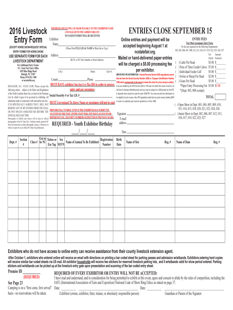 2016 Livestock Entry Form (EXCEPT HORSE SHOWREQUEST SPECIAL ENTRY FORMS FOR HORSE SHOW) USE SEPARATE FORM FOR EACH LIVESTOCK DEPARTMENT For Additional Entry Forms: N.C. State Fair Entry Office 1025