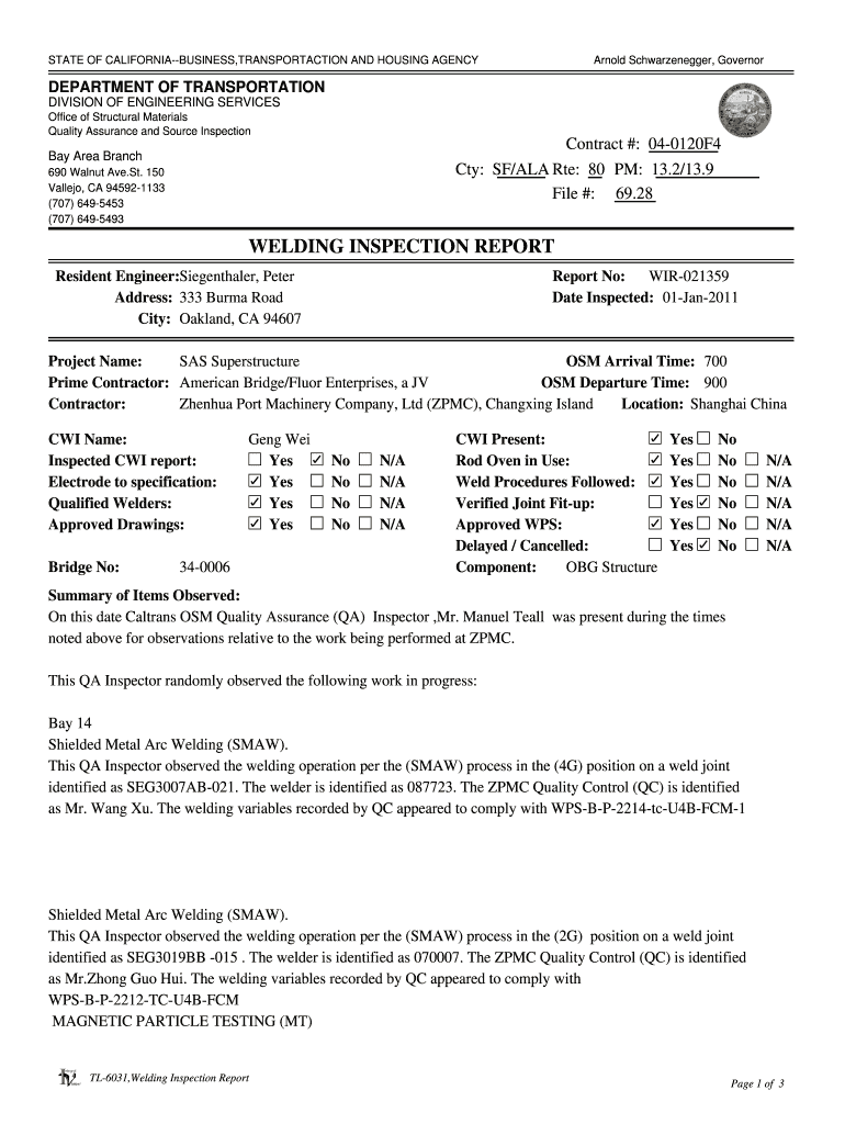 Welders, companies, or welding inspectors responsible for the welding process are required to file welding inspection reports.
