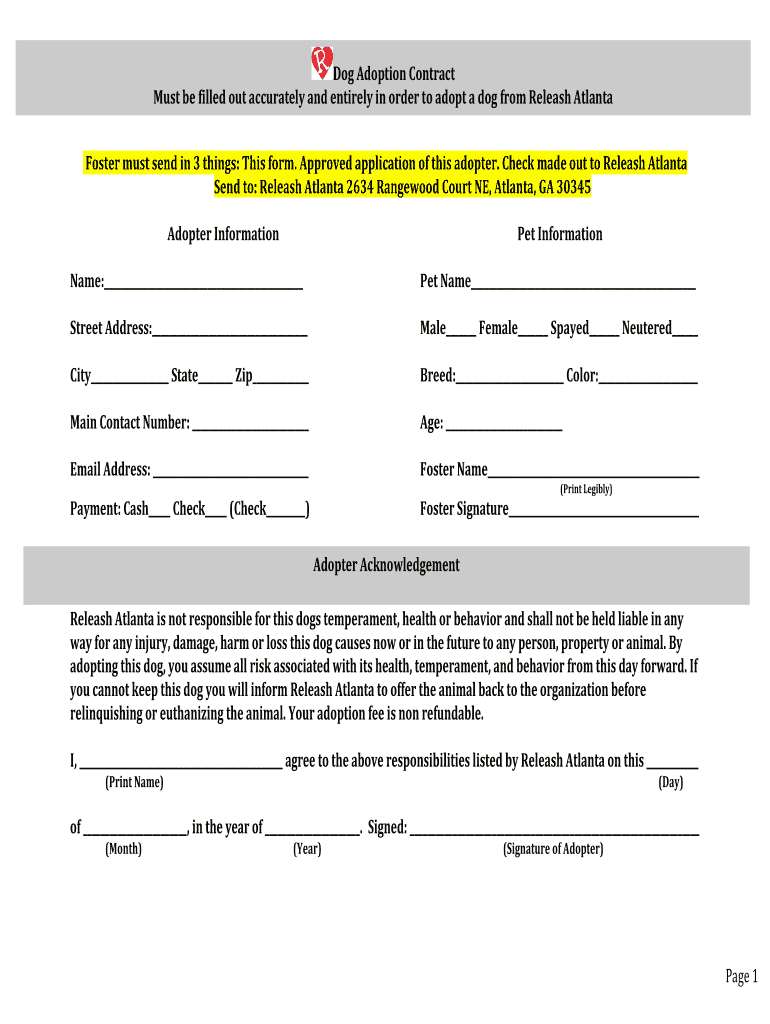Dog Adoption Contract Must be filled out accurately and entirely in order to adopt a dog from Release Atlanta Foster must send in 3 things: This form. Approved application of this adopter. Check made