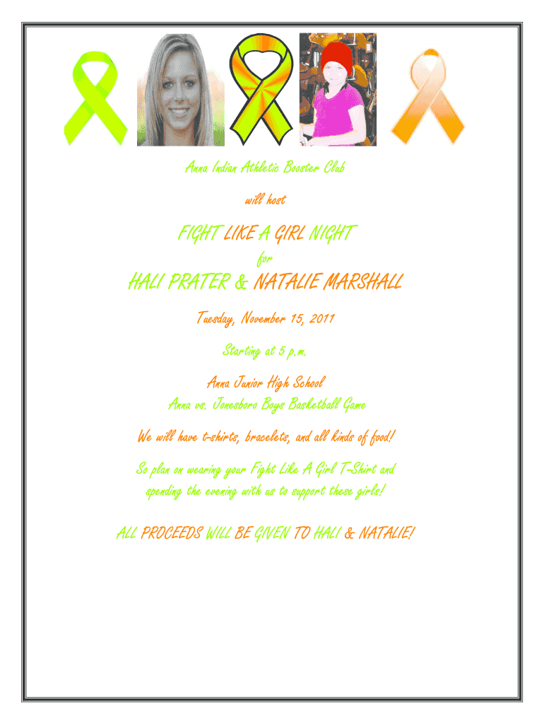 Anna Indian Athletic Booster Club will host FIGHT LIKE A GIRL NIGHT for HALF PRATER & NATALIE MARSHALL Tuesday, November 15, 2011, Starting at 5 p.m. Anna Junior High School Anna vs. Jonesboro Boys