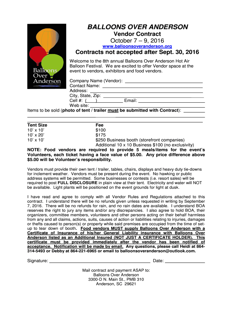 BALLOONS OVER ANDERSON Vendor Contract October 7 9, 2016 www.balloonsoveranderson.org Contracts not accepted after Sept. 30, 2016 Welcome to the 8th annual Balloons Over Anderson Hot Air Balloon Festival.