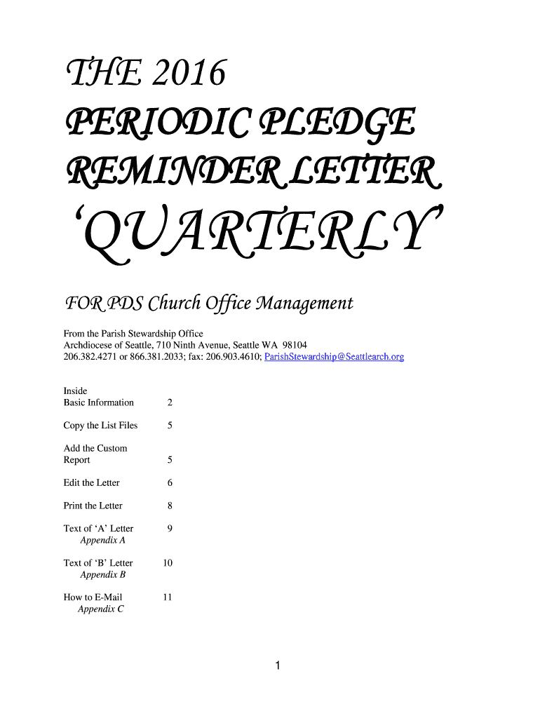 THE 2016 PERIODIC PLEDGE REMINDER LETTER QUARTERLY FOR PDS Church Office Management From the Parish Stewardship Office Archdiocese of Seattle, 710 Ninth Avenue, Seattle WA 98104 206.382.4271 or 866.381.2033;