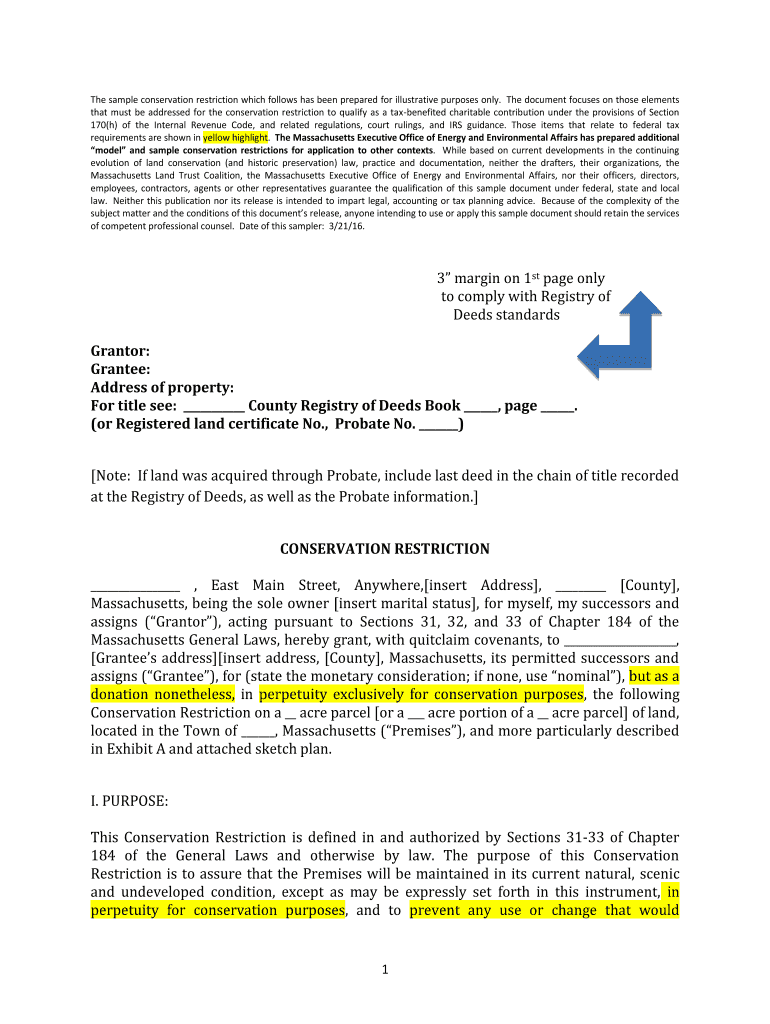 Property owners or land trusts are usually required to file form sample conservation restrictions.