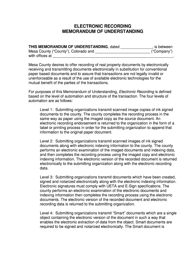 ELECTRONIC RECORDING MEMORANDUM OF UNDERSTANDING THIS MEMORANDUM OF UNDERSTANDING, dated, is between Mesa County (County), Colorado and (Company) with offices at. Mesa County desires to offer recording