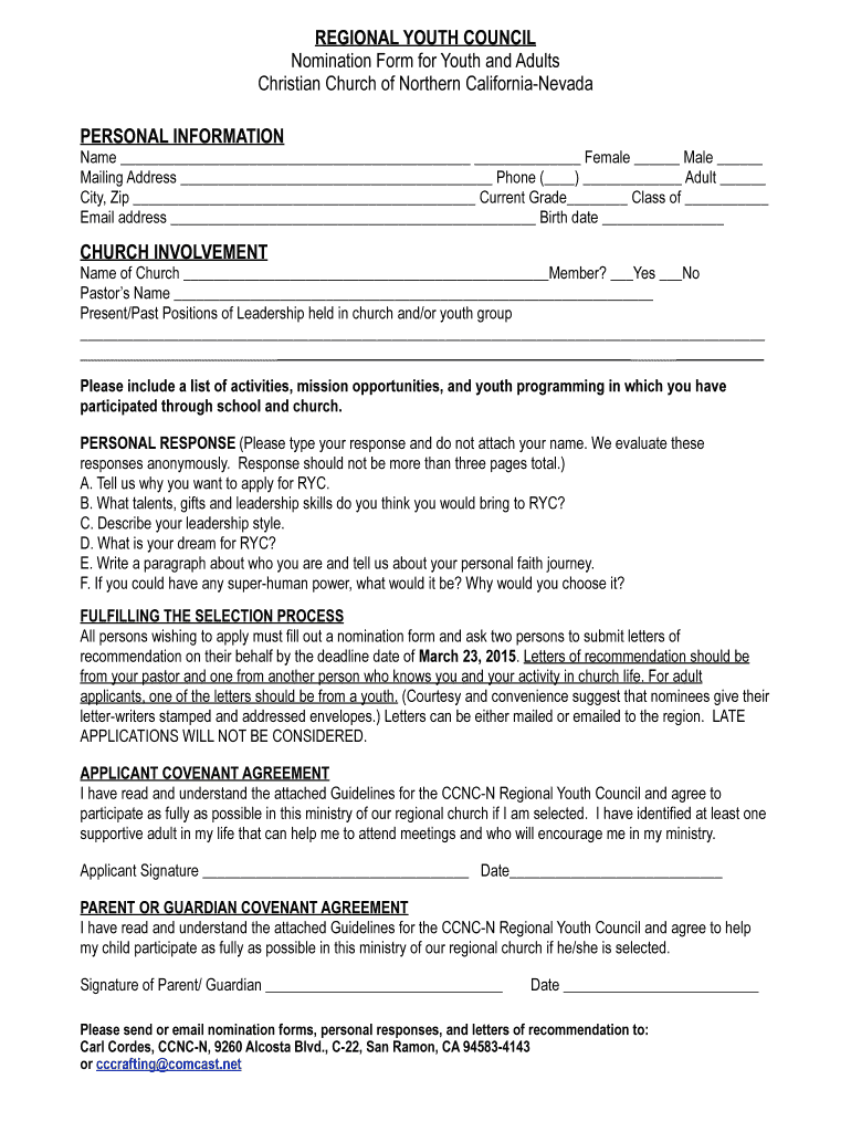 Get the free REGIONAL YOUTH COUNCIL Nomination Form for Youth - ccncn