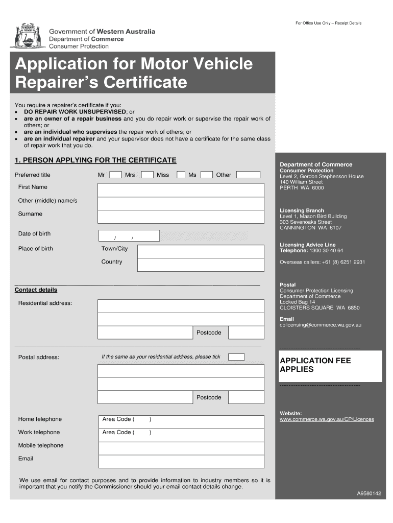 For Office Use Only Receipt Details Application for Motor Vehicle Repairers Certificate You require a repairers certificate if you: DO REPAIR WORK UNSUPERVISED; or are an owner of a repair business,