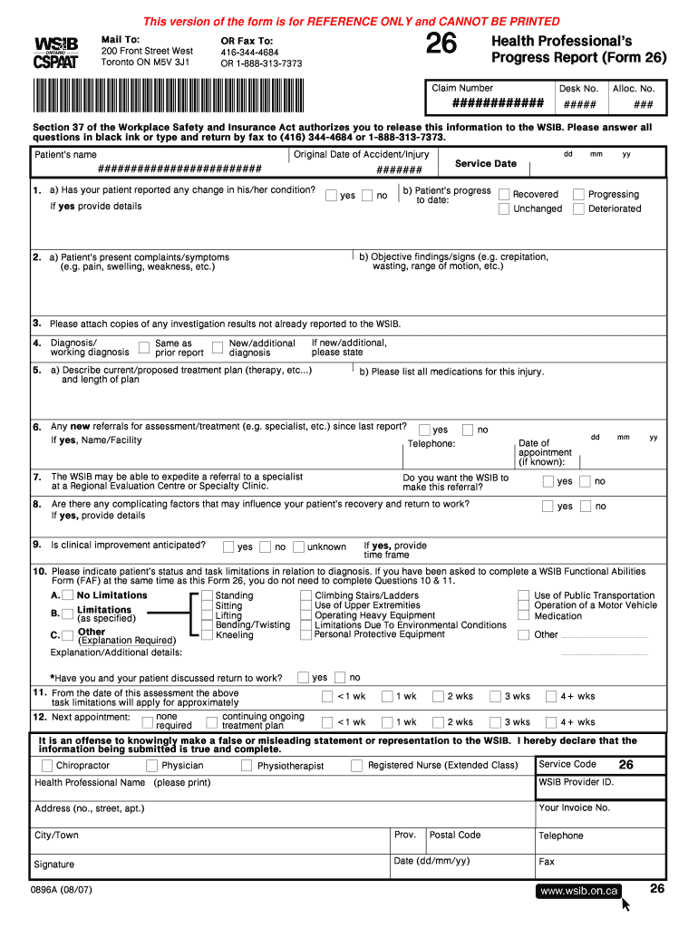 This version of the form is for REFERENCE ONLY and CANNOT BE PRINTED Mail To: 200 Front Street West Toronto ON M5V 3J1 26 OR Fax To: 4163444684 OR 18883137373 Health Professionals Progress Report