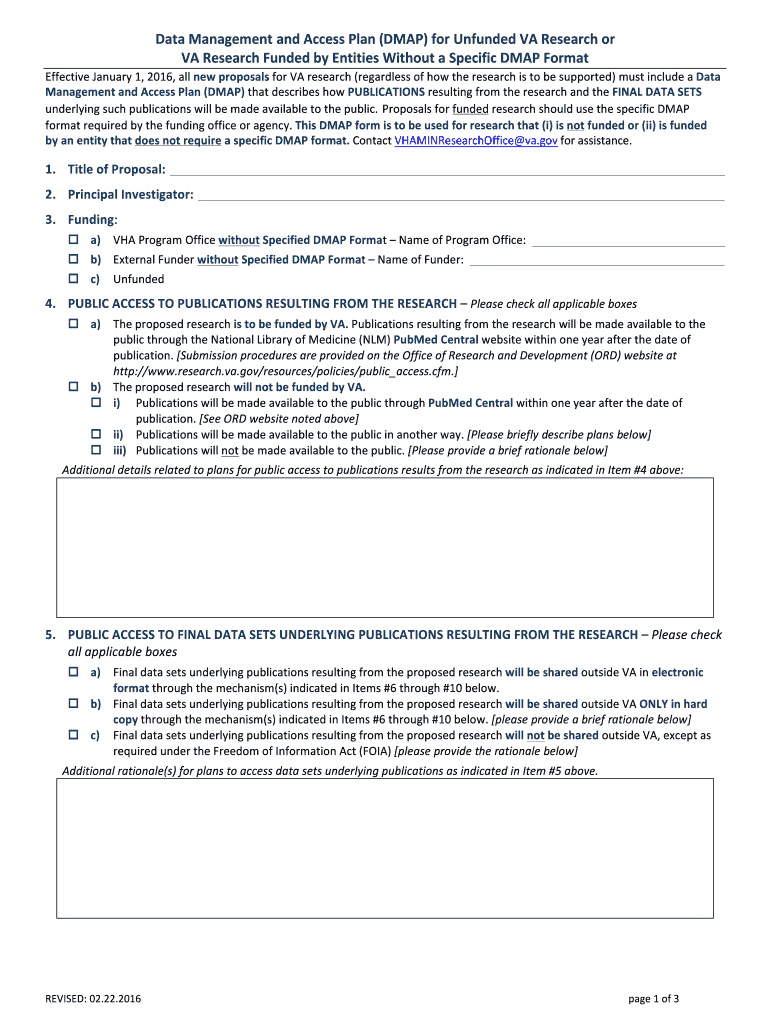 Data Management and Access Plan (MAP) for Unfunded VA Research or VA Research Funded by Entities Without a Specific MAP Format Effective January 1, 2016, all new ...