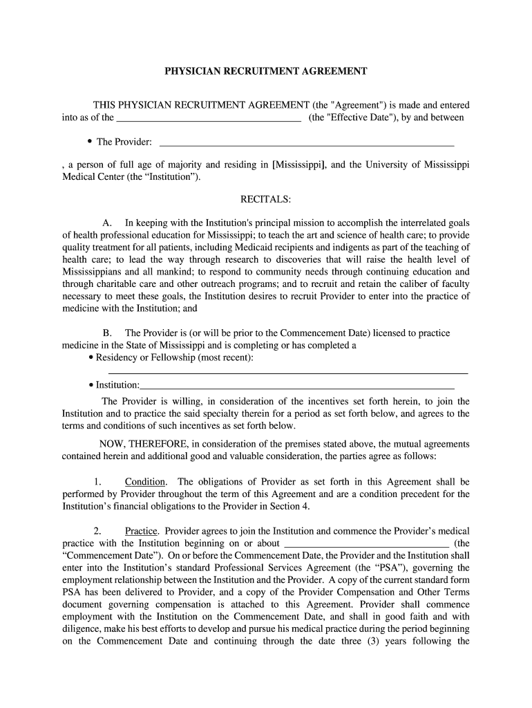 The new physician recruitment agreement is a legal document that outlines the terms and conditions of a recruitment agreement between a healthcare facility and a new physician joining the practice.