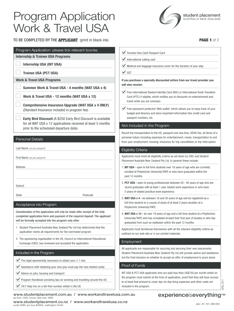 Program Application Work & Travel USA TO BE COMPLETED BY THE APPLICANT (print in black ink) Program Application: please tick relevant box/BS PAGE 1 of 2 Traveled Visa Cash Passport Card Internship
