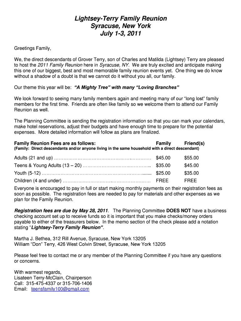 Any family member who is involved in organizing or coordinating the reunion may be required to file the lightsey-terry family reunion syracuse.