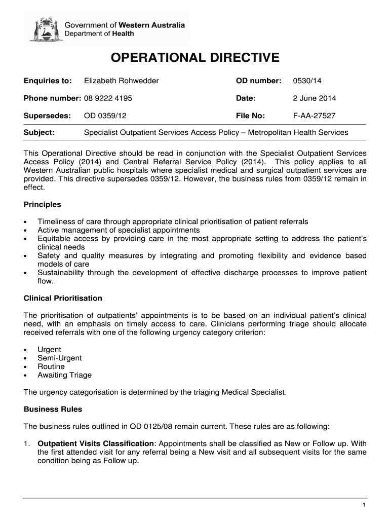 OPERATIONAL DIRECTIVE Inquiries to: Elizabeth Redder OD number: 0530/14 Phone number: 08 9222 4195 Date: 2 June 2014 Supersedes: OD 0359/12 File No: FAA27527 Subject: Specialist Outpatient Services
