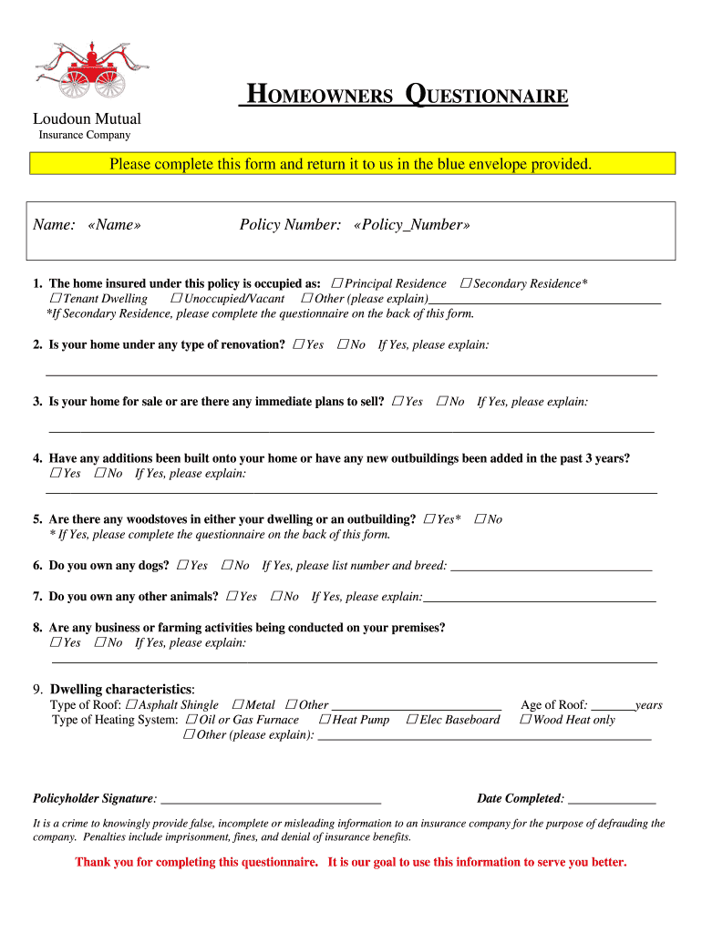 HOMEOWNERS QUESTIONNAIRE London Mutual Insurance Company Please complete this form and return it to us in the blue envelope provided. Name: Name Policy Number: Policy Number Principal Residence Secondary