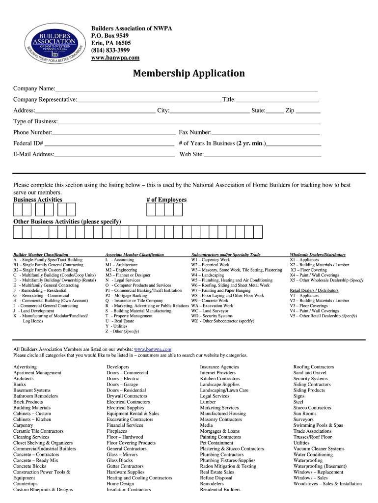 Builders Association of WPA P.O. Box 9549 Erie, PA 16505 (814) 833-3999 www.banwpa.com Membership Application Company Name: Company Representative: Title: Address: City: State: Zip Type of Business: