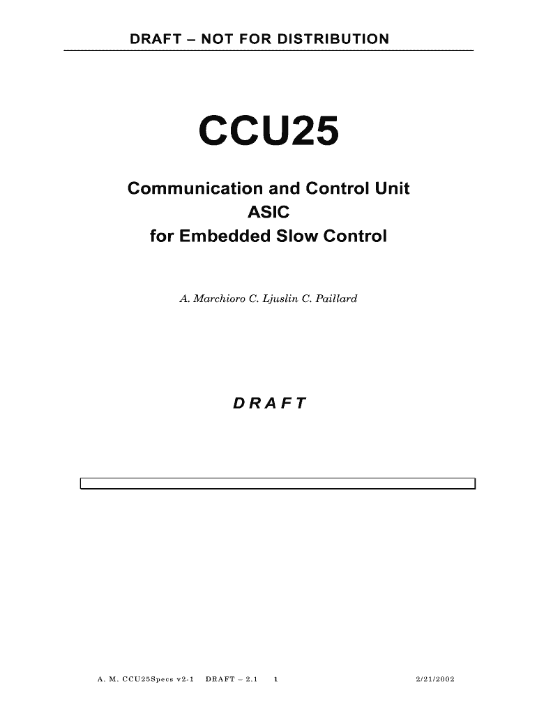 DRAFT NOT FOR DISTRIBUTION CCU25 Communication and Control Unit ASIC for Embedded Slow Control A. Marching C. Justin C. Pail lard DRAFT A. M. CCU25Spe c s v 21 DRAFT 2.1 1 2/21/2002 DRAFT NOT FOR