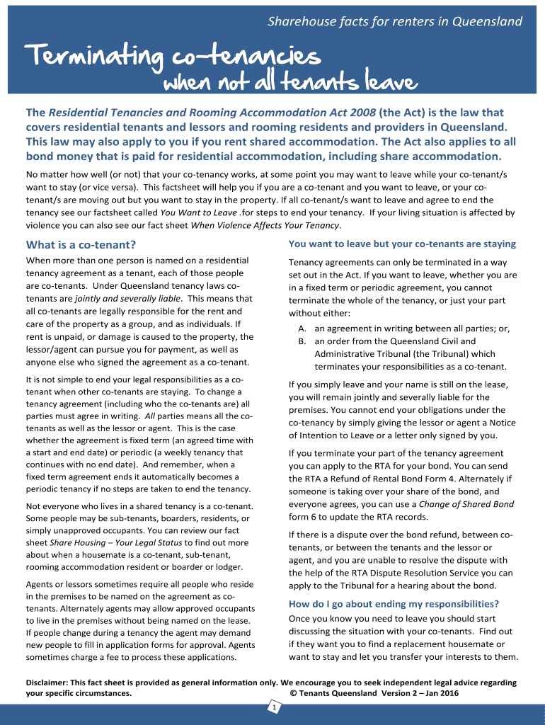 Share house facts for renters in QueenslandTerminating cotenancieswhen not all tenants leave Residential Tenancies and Rooming Accommodation Act 2008 (the Act) is the law that