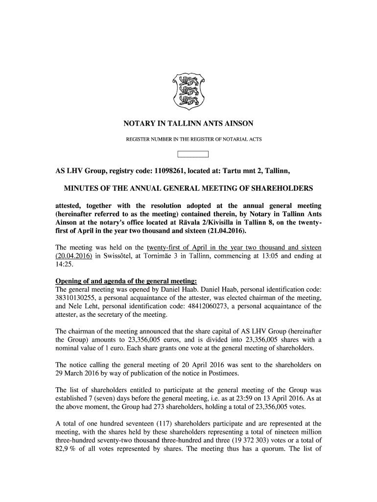NOTARY IN TALLINN ANTS VINSON REGISTER NUMBER IN THE REGISTER OF NOTARIAL ACTS AS LHV Group, registry code: 11098261, located at: Tart MNT 2, Tallinn, MINUTES OF THE ANNUAL GENERAL MEETING OF SHAREHOLDERS