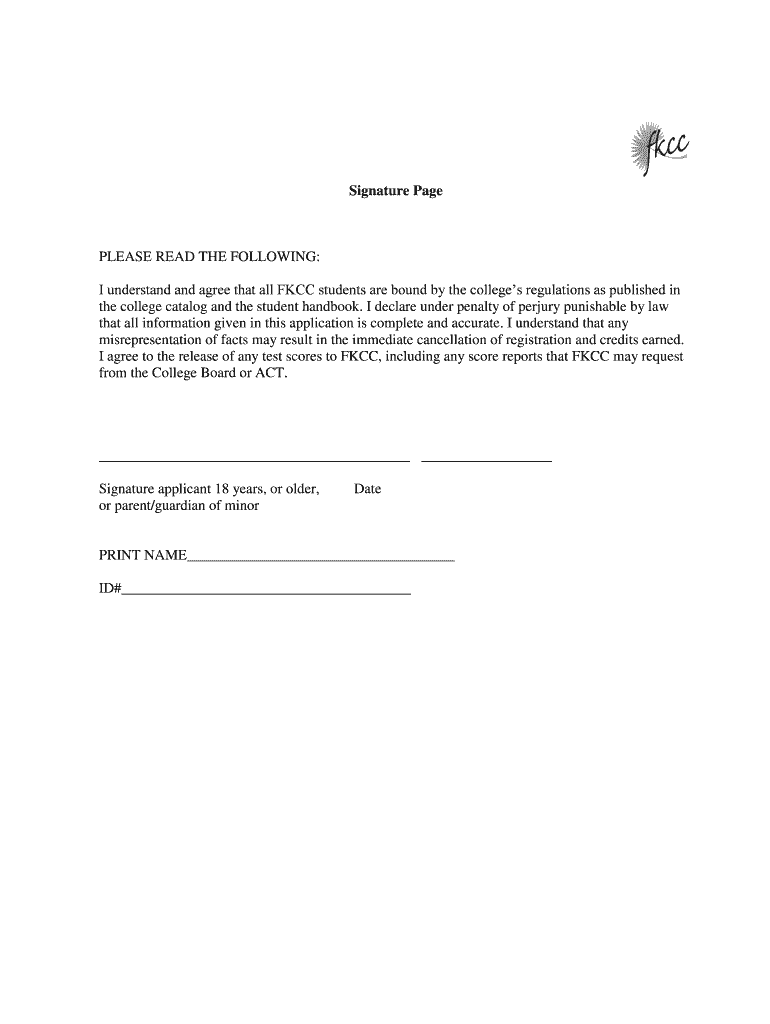 Signature Page PLEASE READ THE FOLLOWING: I understand and agree that all FCC students are bound by the colleges regulations as published in the college catalog and the student handbook. I declare