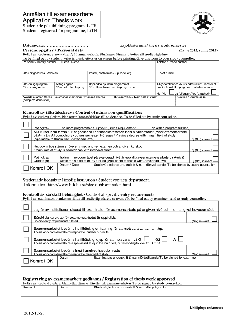 The Thesis Work Application Form is an official document used by students at LiTH to apply for thesis work related to their study program.