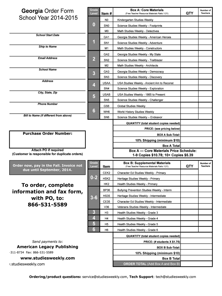 Get the free Georgia Order Form School Year 2014-2015 - Studies Weekly