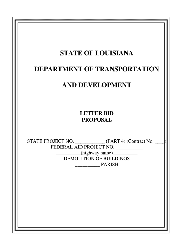 STATE OF LOUISIANA DEPARTMENT OF TRANSPORTATION AND DEVELOPMENT LETTER BID PROPOSAL STATE PROJECT NO. (PART 4) (Contract No. ) FEDERAL AID PROJECT NO. (highway name) DEMOLITION OF BUILDINGS PARISH