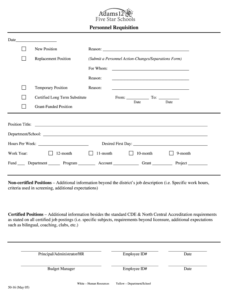 Personnel Requisition Date New Position Reason: Replacement Position (Submit a Personnel ActionChanges/Separations Form) For Whom: Reason: Temporary Position Reason: Certified Long Term Substitute