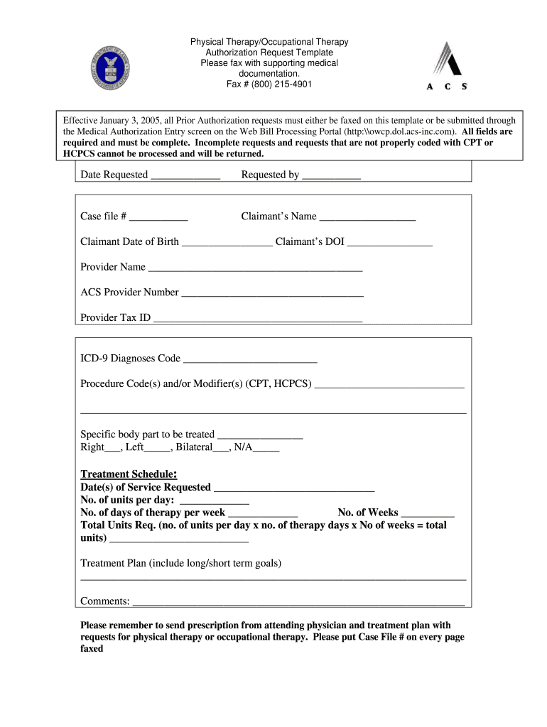 Physical Therapy/Occupational Therapy Authorization Request Template Please fax with supporting medical documentation. Fax # (800) 2154901 Effective January 3, 2005, all Prior Authorization requests
