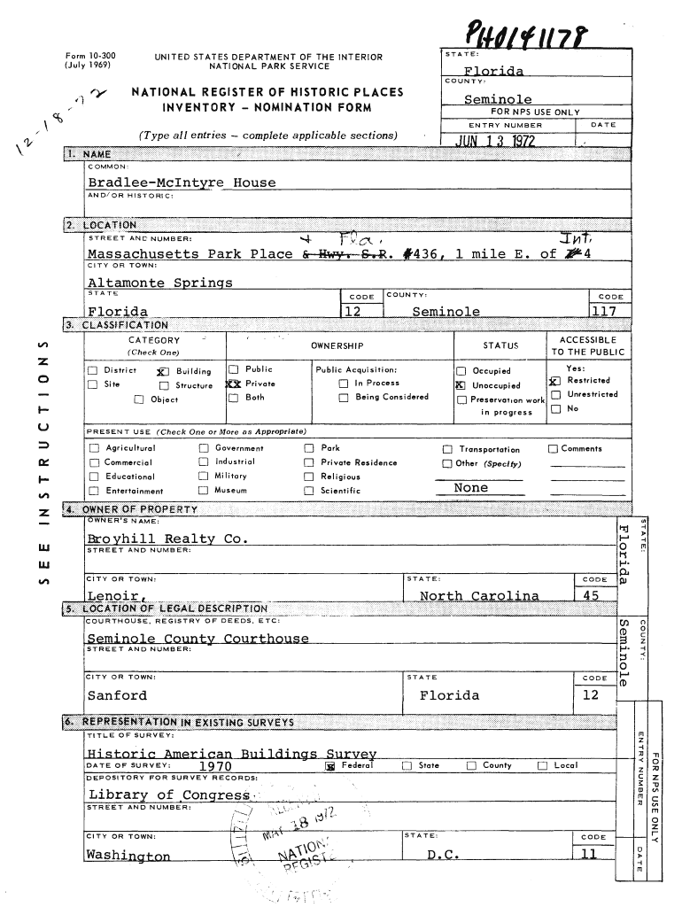Form 10300 (July 1969) STATE: UNITED STATES DEPARTMENT OF THE INTERIOR NATIONAL PARK SERVICE Florida COUNTY: “X / NATIONAL REGISTER OF HISTORIC PLACES INVENTORY NOMINATION FORM Seminole FOR NPS