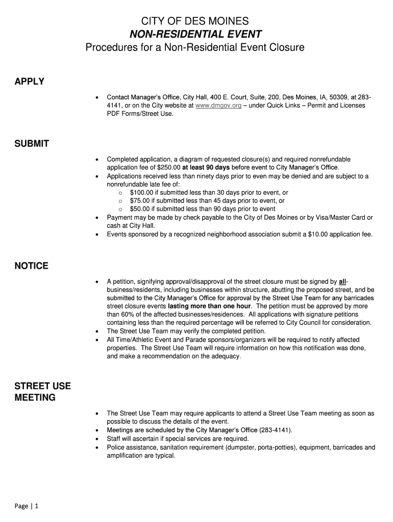 CITY OF DES MOINES NONRESIDENTIAL EVENT Procedures for a Nonresidential Event Closure APPLY Contact Managers Office, City Hall, 400 E. Court, Suite, 200, Des Moines, IA, 50309, at 2834141, or on the
