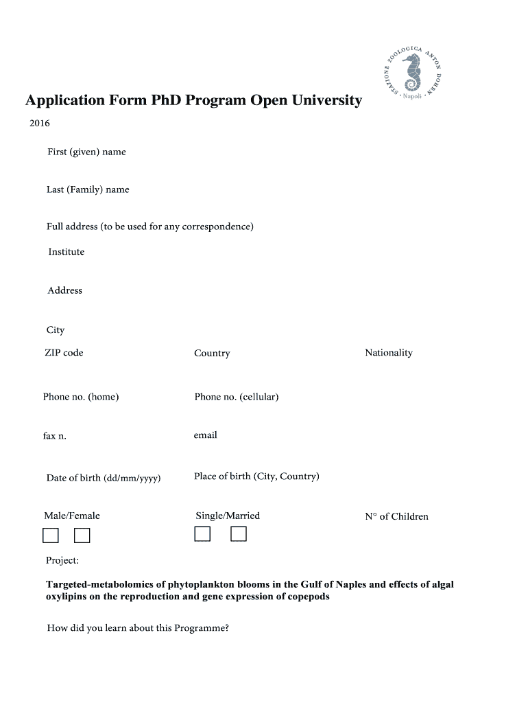 Application Form PhD Program Open University. Nationality. Phone no ... of birth (dd/mm/YYY). Place of birth (City, Country) email fax n. ZIP code. Country. 2016 ...