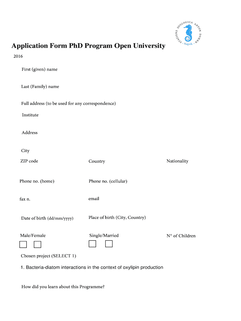 Application Form PhD Program Open University. Nationality. Phone no. ... Country. 2016. 1. Bacteria-diatom interactions in the context of oxytocin production ...