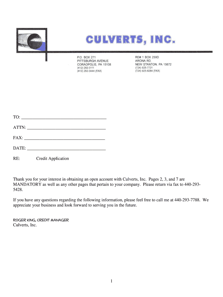 TO: ATTN: FAX: DATE: RE: Credit Application Thank you for your interest in obtaining an open account with Culverts, Inc. Pages 2, 3, and 7 are MANDATORY as well as any other pages that pertain to