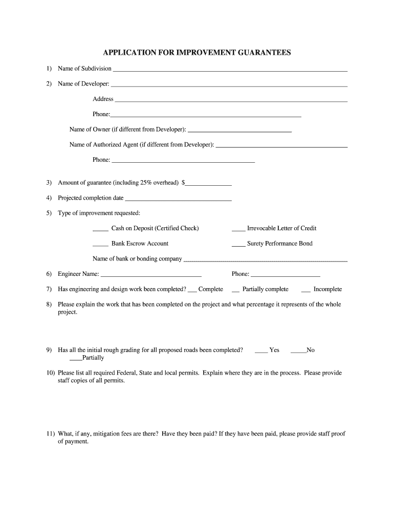 APPLICATION FOR IMPROVEMENT GUARANTEES 1) Name of Subdivision 2) Name of Developer: Address Phone: Name of Owner (if different from Developer): Name of Authorized Agent (if different from Developer):