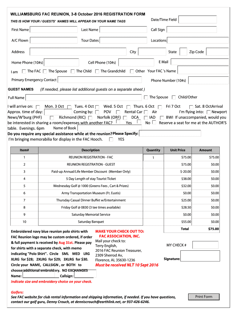 WILLIAMSBURG FAC REUNION, 3-8 October 2016 REGISTRATION FORM. THIS IS HOW YOUR / GUESTS NAMES WILL APPEAR ON YOUR NAME TAGS. First