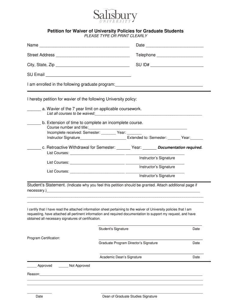 Get the free PETITION FOR WAIVER OF UNIVERSITY POLICIES - salisbury