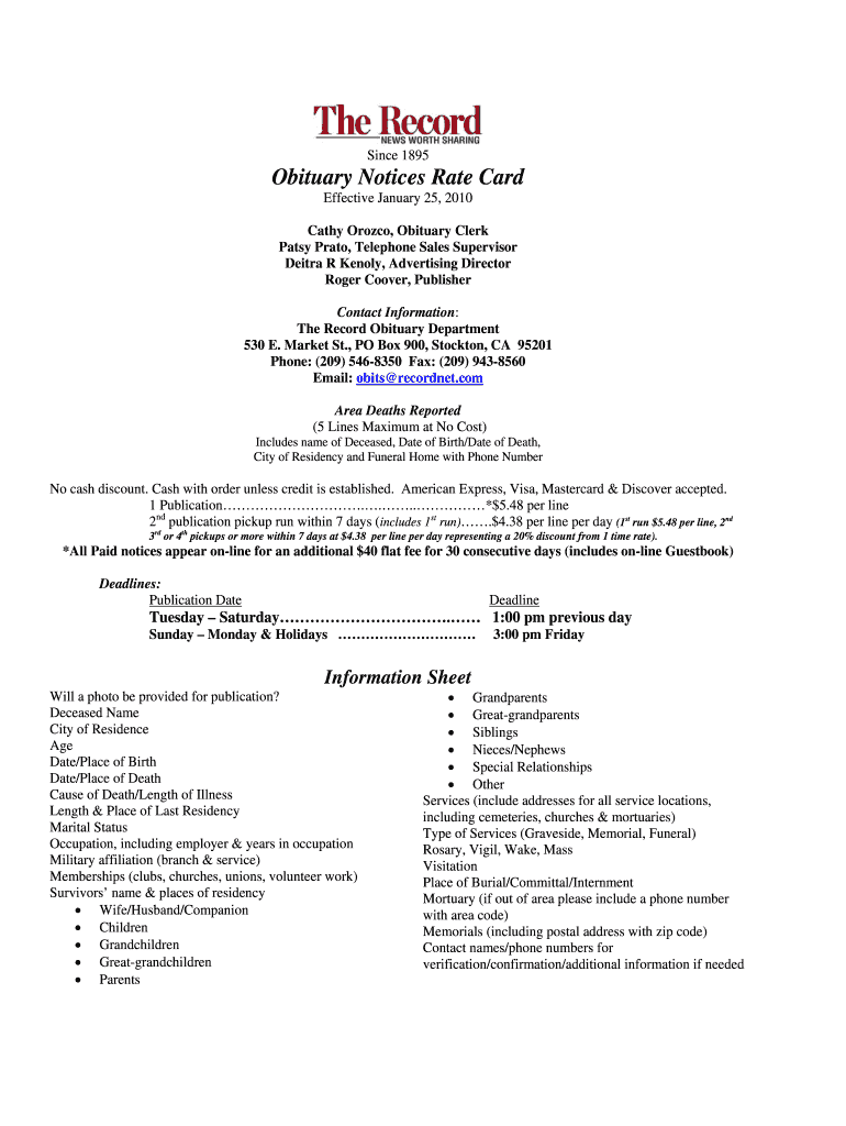 Since 1895 Obituary Notices Rate Card Effective January 25, 2010, Cathy Orozco, Obituary Clerk Patsy Plato, Telephone Sales Supervisor Data R Kelly, Advertising Director Roger Cover, Publisher Contact