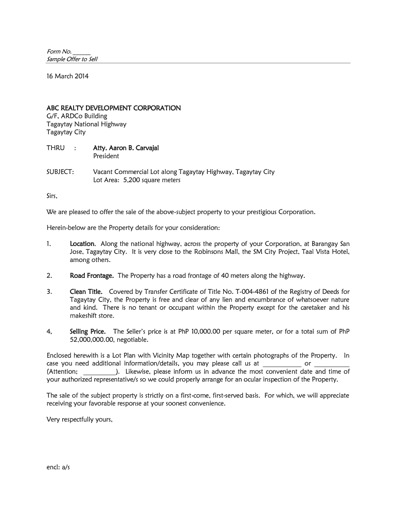 Form No. Sample Offer to Sell 16 March 2014 ABC REALTY DEVELOPMENT CORPORATION G/F, ARRCO Building Magsaysay National Highway Magsaysay City Through : SUBJECT: Atty. Aaron B. Carvajal President Vacant