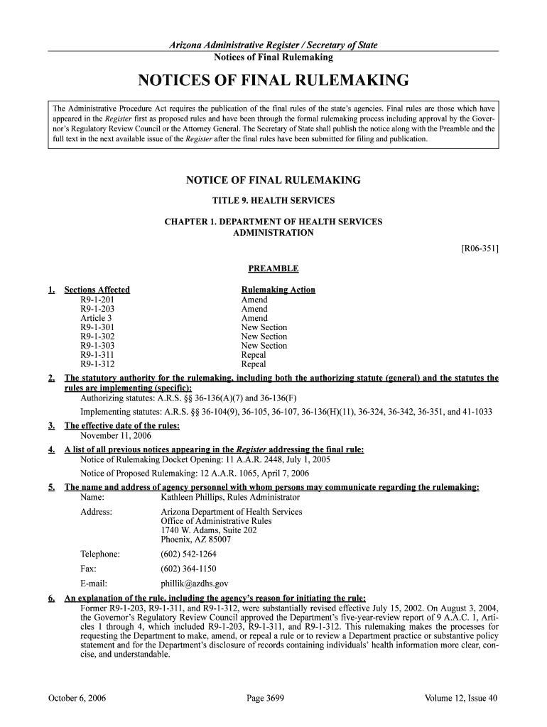 Arizona Administrative Register / Secretary of State Notices of Final Rule making NOTICES OF FINAL REMAKING The Administrative Procedure Act requires the publication of the final rules of the states