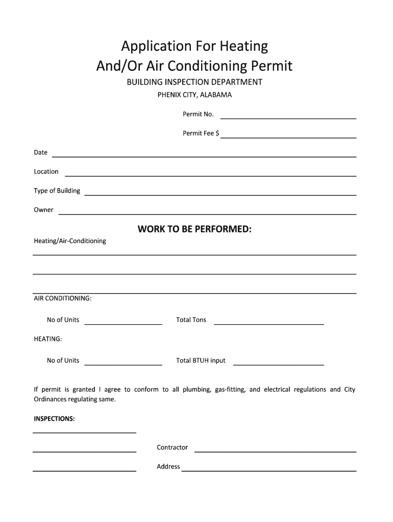 Application For Heating. BUILDING INSPECTION DEPARTMENT. PHENIX CITY, ALABAMA. If permit is granted I agree to conform to all plumbing, gas-fitting, ...