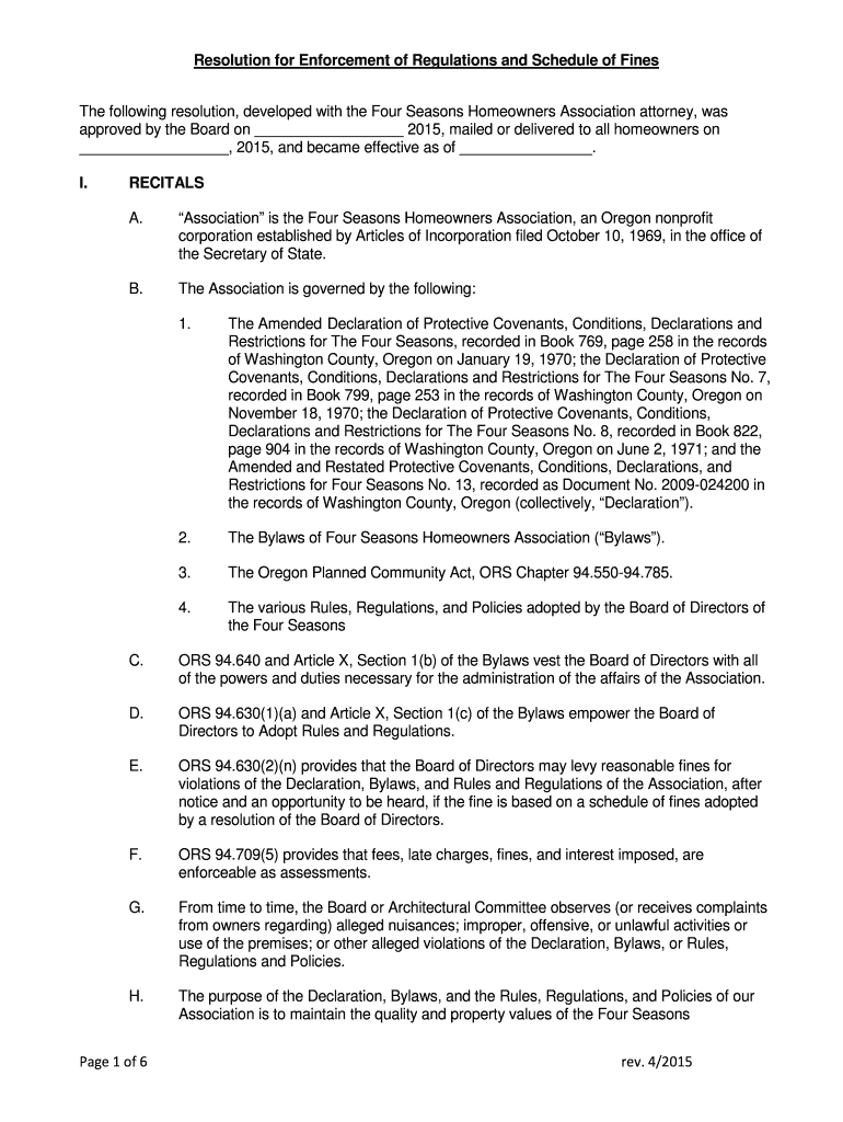 Resolution for Enforcement of Regulations and Schedule of Fines The following resolution, developed with the Four Seasons Homeowners Association attorney, was approved by the Board on 2015, mailed