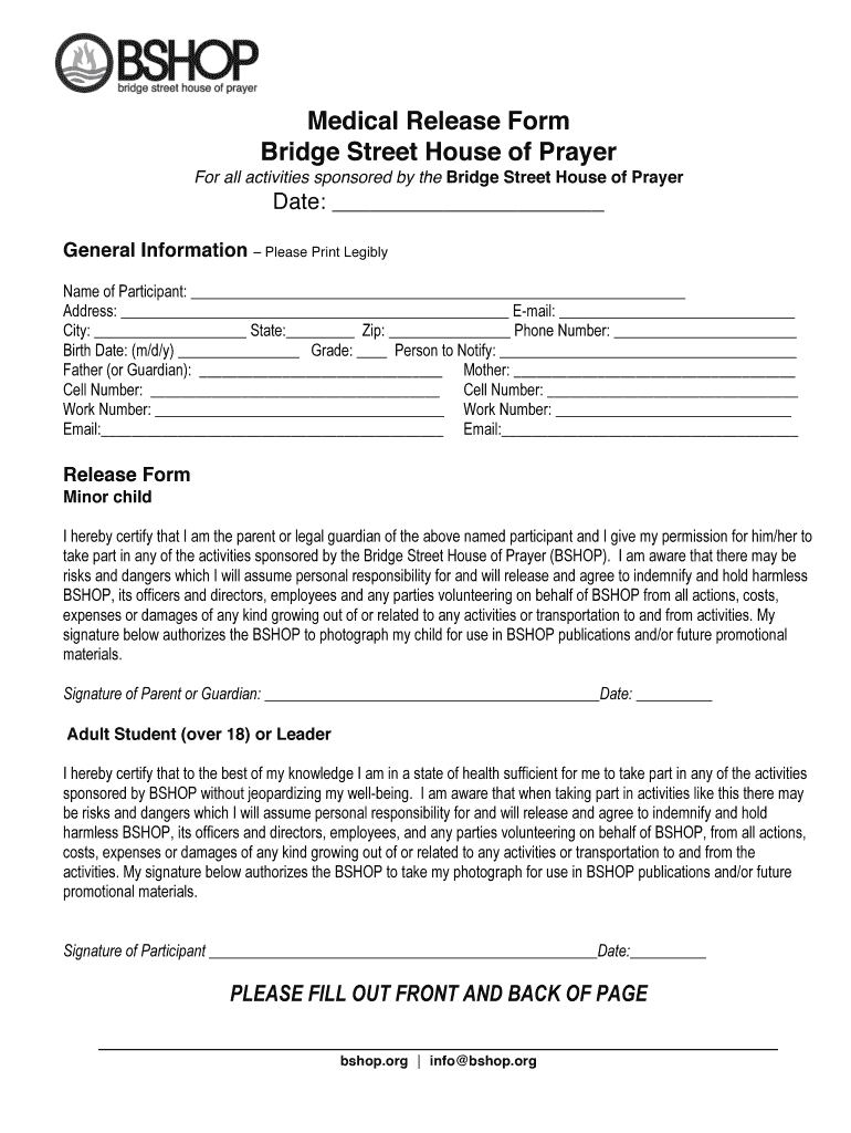 Medical Release Form Bridge Street House of Prayer For all activities sponsored by the Bridge Street House of Prayer Date: General Information Please Print Legibly Name of Participant: Address: Email: