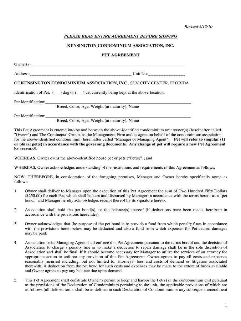 Revised 5/12/10 PLEASE READ ENTIRE AGREEMENT BEFORE SIGNING KENSINGTON CONDOMINIUM ASSOCIATION, INC. PET AGREEMENT Owner(s) Address: Unit No: OF KENSINGTON CONDOMINIUM ASSOCIATION, INC., SUN CITY
