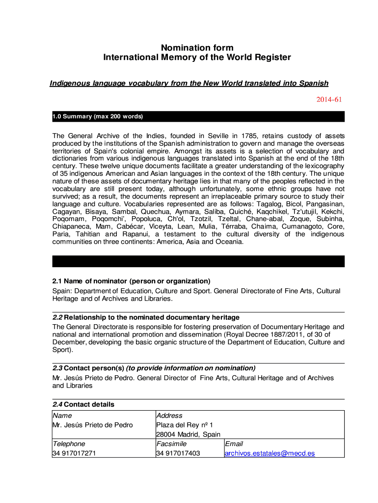 Get the free Nomination form International Memory of the World - unesco