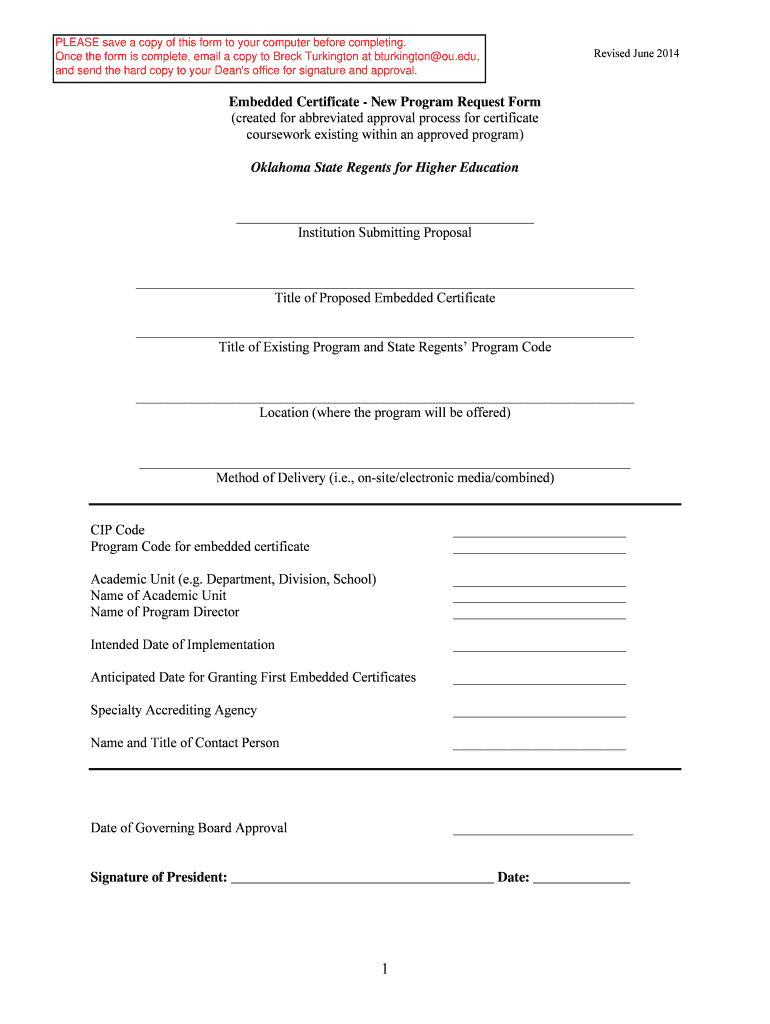 Revised June 2014 1 Embedded Certificate ... email a copy to Break Tarkington at Burlington of.edu, and send the hard copy to your Dean's office for signature and ...