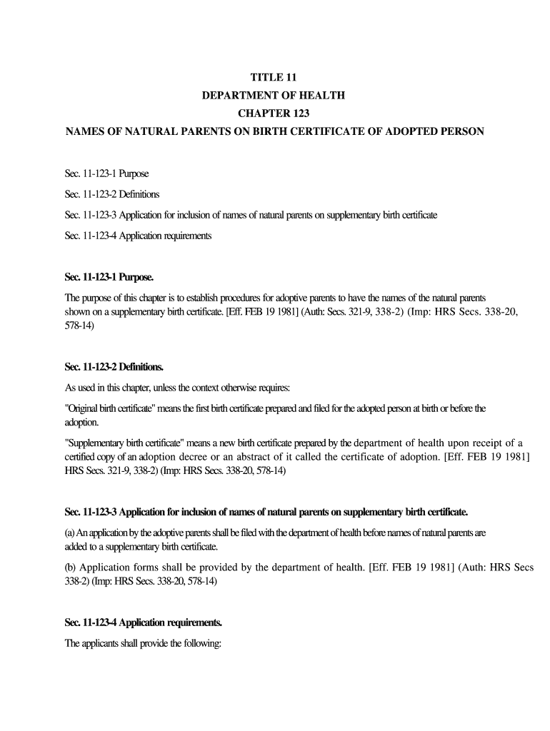 TITLE 11 DEPARTMENT OF HEALTH CHAPTER 123 NAMES OF NATURAL PARENTS ON BIRTH CERTIFICATE OF ADOPTED PERSON Sec. 111231 Purpose Sec. 111232 Definitions Sec. 111233 Application for inclusion of names