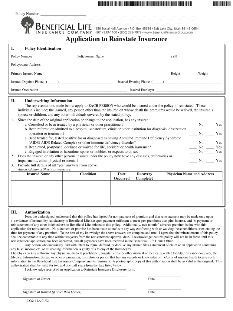 Get the free Application to Reinstate Insurance - Beneficial Financial Group