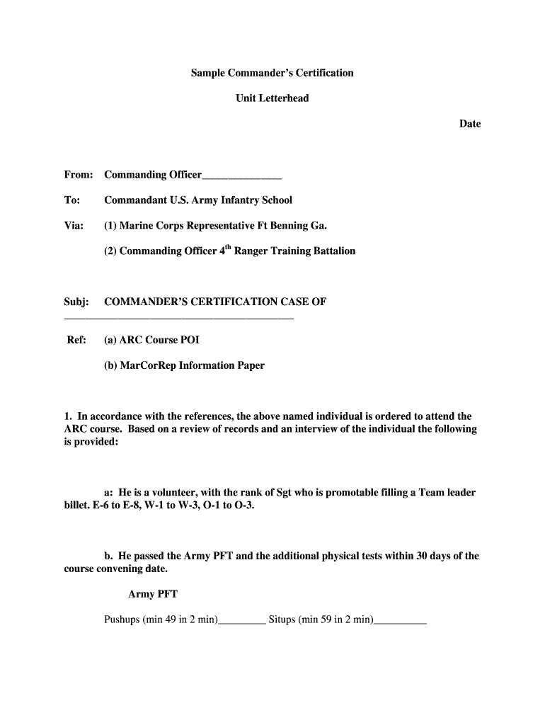 Sample Commanders Certification Unit Letterhead Date From: Commanding Officer To: Commandant U.S. Army Infantry School Via: (1) Marine Corps Representative Ft Benning Ga. (2) Commanding Officer 4th