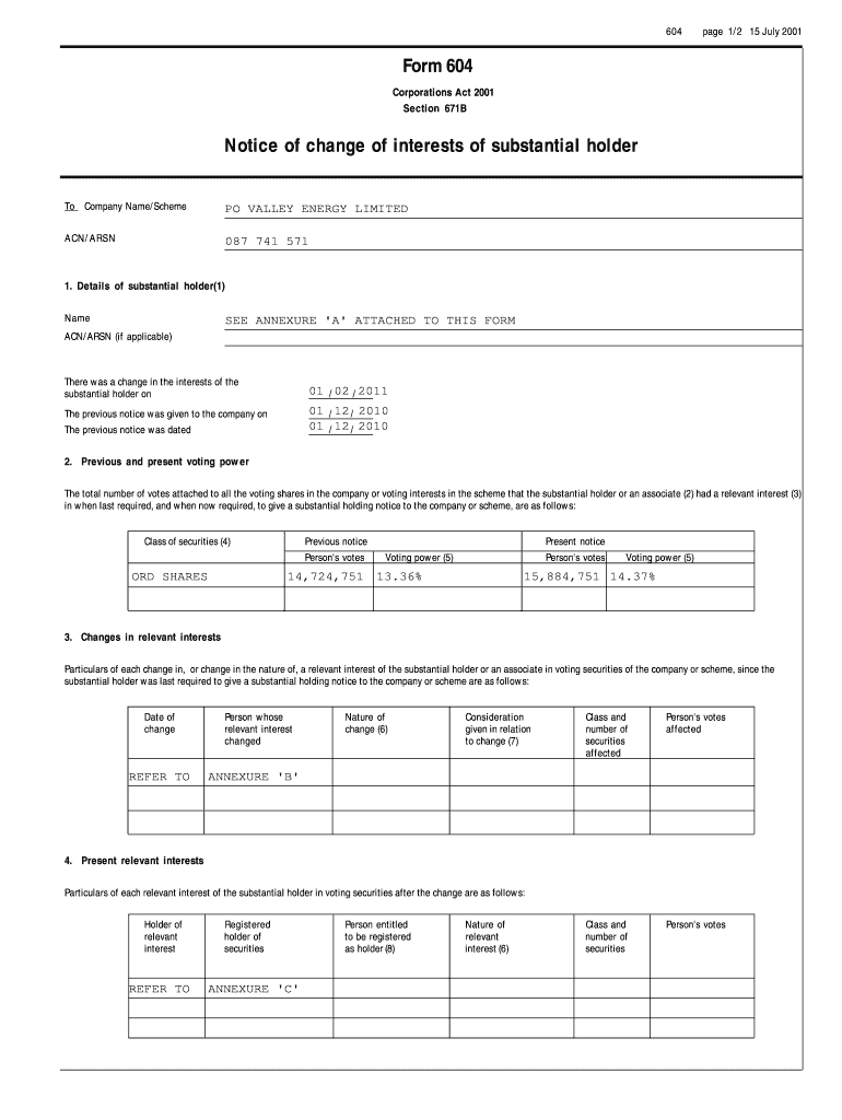 604 page 1/2 15 July 2001 To Company Name/Scheme ACN/ARSON 1. Details of substantial holder(1) Name ACN/ARSON (if applicable) There was a change in the interests of the.