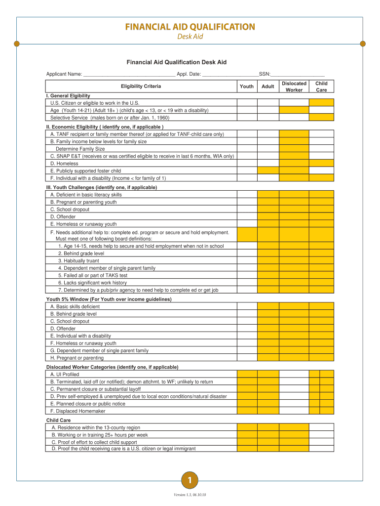 FINANCIAL AID QUALIFICATION Desk Aid Financial Aid Qualification Desk Aid Applicant Name: Apply. Date: SSN: Eligibility Criteria Youth I. General Eligibility U.S. Citizen or eligible to work in the