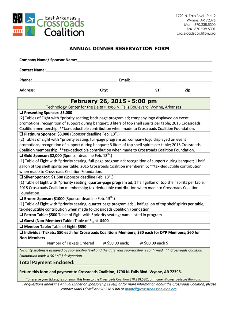 1790 N. Falls Blvd., Ste. 2 Wynne, AR 72396 Main: 870.238.5300 Fax: 870.238.5301 crossroads coalition.org ANNUAL DINNER RESERVATION FORM Company Name/ Sponsor Name: Contact Name: Phone: Email: Address: